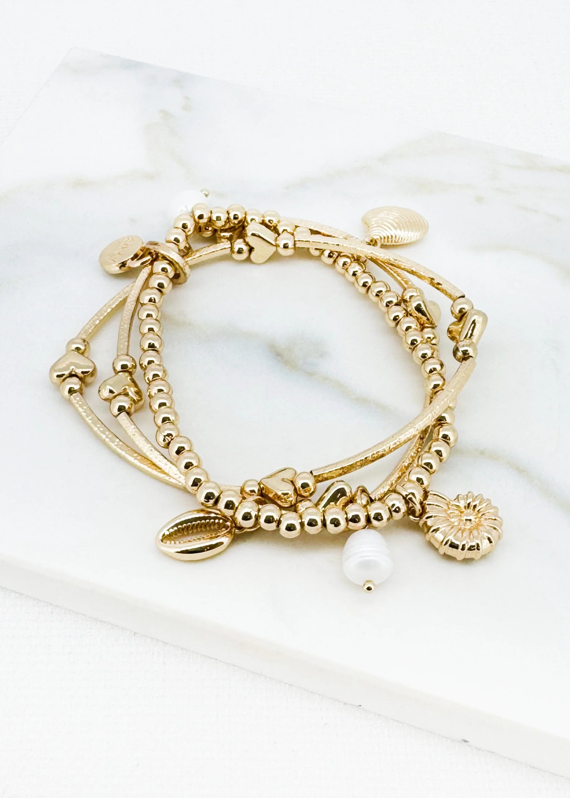 Gold triple layer bead and bar elasticated bracelet with pearl and shell charms